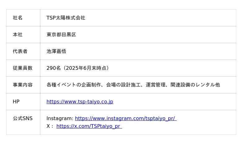 2025年で設立70周年を迎えたTSP太陽株式会社は、空間ソリューションによるイベントコンサルティングから企画・制作まで、あらゆる感動の場を一気通貫した支援で創造するプロフェッショナル集団です。国際的なビッグイベントを始め、あらゆるイベントに携わるデザイン・コンサルティング会社として、収益の最大化を図る事前収支計画から企画・クリエイティブ制作・建築設計・施工・運営までをトータルソリューションとして提供しています。