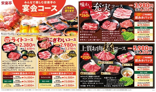 安楽亭の宴会コースは、焼肉専門店ならではの満足感をそのままに、幅広い年代が楽しめる構成。