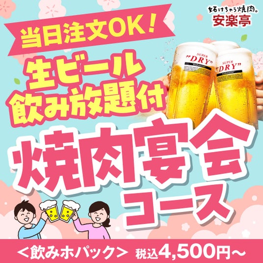 【春休み!安楽亭で思い出焼肉♪】グループ全員学生さんで「食べホ学割」500円OFF!!期間限定でお世話になった先生等を1名無料でご招待!ご家族やご友人のお集まりにはお得な飲み放題付き焼肉宴会コース!!