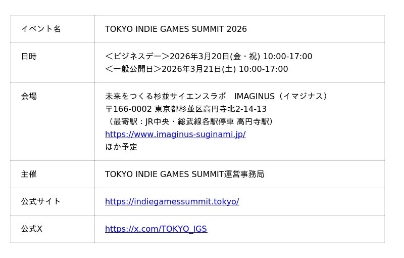 株式会社Phoenixx(フィーニックス)(東京都武蔵野市、代表取締役社長:坂本 和則)は、2026年3月20日(金・祝)~21日(土)に「未来をつくる杉並サイエンスラボ IMAGINUS(イマジナス)」にて開催されるインディーゲームイベント『TOKYO INDIE GAMES SUMMIT 2026(以下、TIGS2026)』について、出展タイトル、会場全体マップ、3月16日(月)のオンラインショーケース詳細、会場内実施コンテンツなど、本イベントの全貌を一挙公開いたしました。