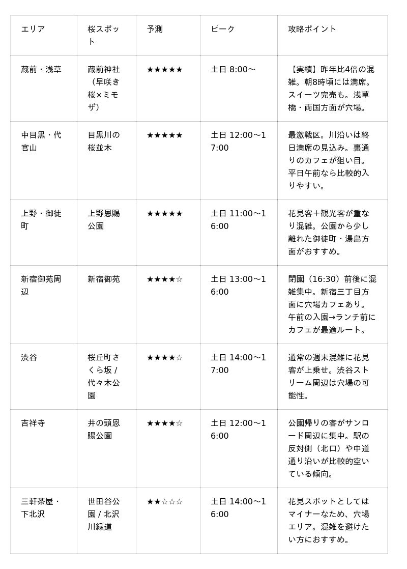 桜の名所に近い主要カフェエリアについて、お花見シーズン(3月下旬~4月上旬)の混雑予測をまとめました。