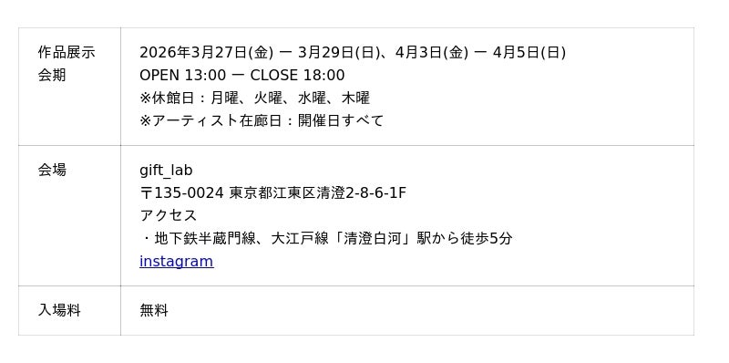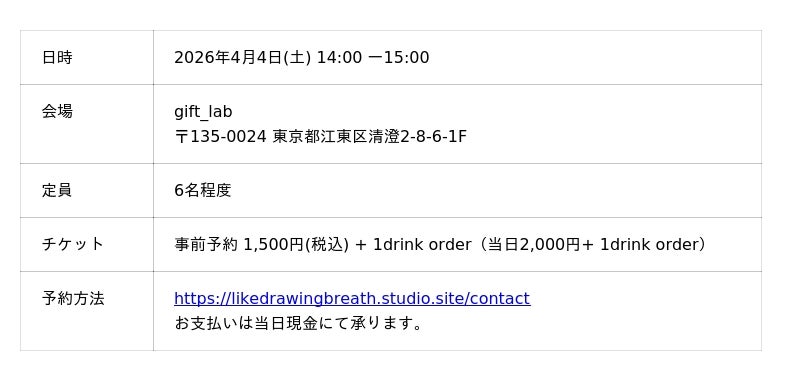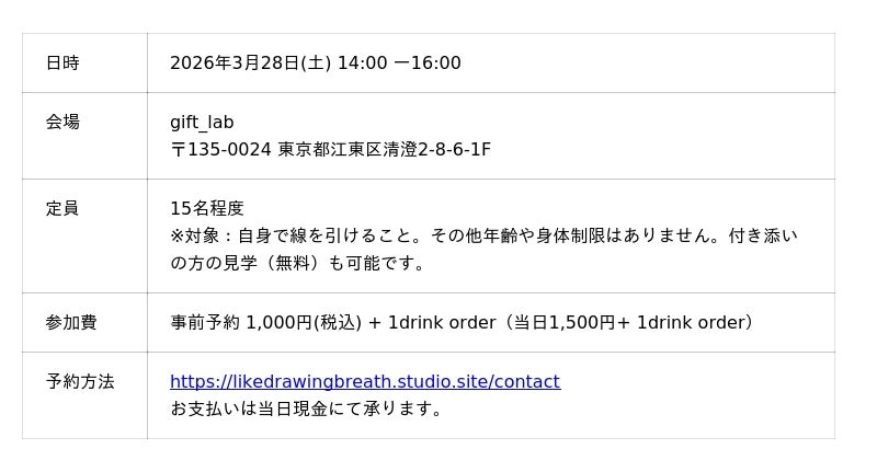 意識をテーマにドローイング活動を行う美術家ASUKI/LIKE DRAWING BREATHによるパフォーマンス、ワークショップ、エキジビジョンを2026年3月27日から4月5日までの期間中、東京清澄白河 gift_lab にて開催します。