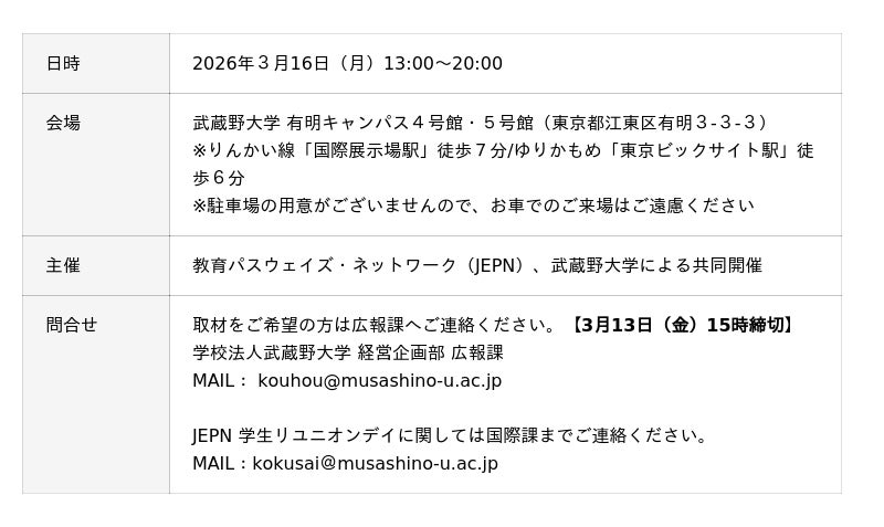 武蔵野大学(東京都江東区、学長:小西 聖子)は、3月16日(月)に教育パスウェイズ・ネットワーク(JEPN)と共催で「JEPN学生リユニオンデイ」を有明キャンパスにて開催します。