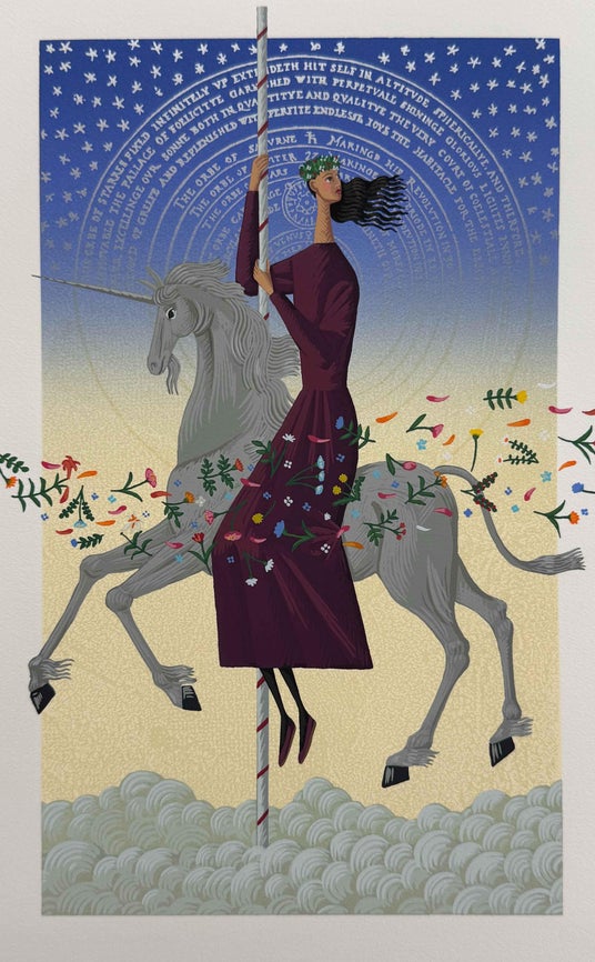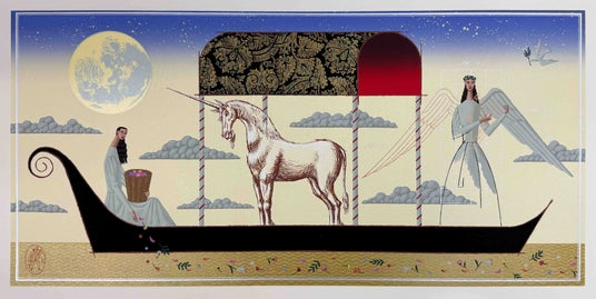 数多くのベストセラー作品の挿画を手掛け、その独特な様式美と静謐な世界観でファンを魅了し続ける北見 隆氏。本展では、古典的な情緒と現代的な感性が融合した最新の試みとなる作品も含め、原画・シルクスクリーン・リトグラフ・ジクレーをあわせて約40点展観、星空や月、ユニコーンや天使といった象徴的なモチーフが、北見氏独自の緻密なタッチと豊かな色彩で描かれた作品となって並びます。