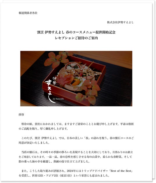 「伊勢すえよし」は、三重県の生産者から直接届く食材を使用した懐石料理を提供しています 。今回のレセプションでは、参加者の属性に合わせ、以下の2つの目的を軸に開催されました 。■ メディア・報道関係者様を招待した目的: