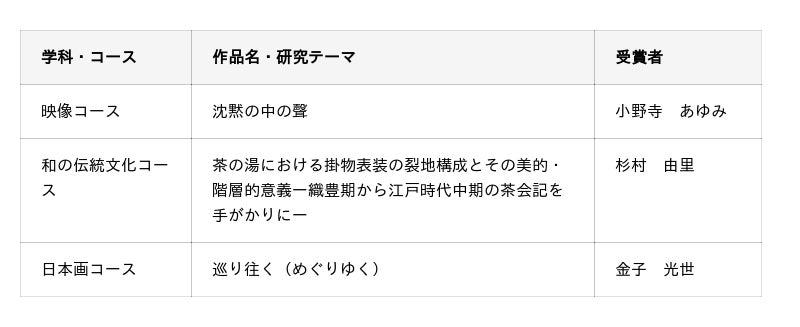 本展では、各コースで優れた卒業・修了制作に対して賞が授与されています。