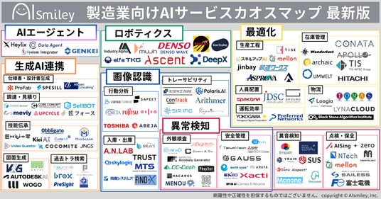 製造業向けAIサービスカオスマップは、課題解決の手がかりや最適化技術による生産プロセスの効率化、AIエージェントを活用した業務支援として急速に進化するAIソリューションを6カテゴリーでわかりやすく分類化したカオスマップです。