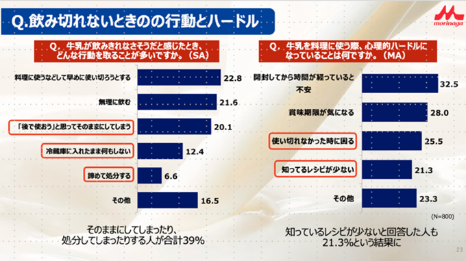 最後に、飲み切れないときの行動とハードルとして、牛乳が飲みきれなさそうだと感じたとき、そのままにしてしまったり、処分してしまったりする人が39%いることがわかりました。「牛乳を料理に使う際、心理的ハードルになっていることは何ですか」という質問に対しては、知っているレシピが少ないと回答した人も21.3%という結果になりました。