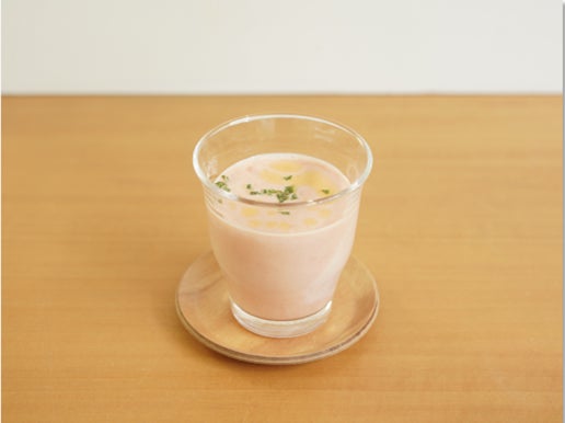 森永おいしい牛乳と無塩トマトジュースに、オリーブオイルとスイートバジルを少々加えるだけのお手軽レシピ。レンジで温めればスープに、冷たいまま混ぜればラテになるという画期的なアイデアです。