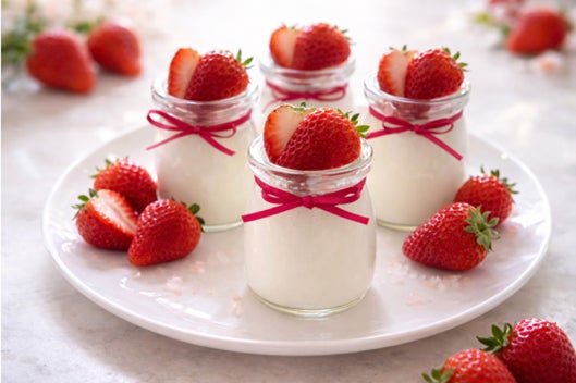 アスリートフードマイスターの亀井氏は、森永おいしい高たんぱく高カルシウムを使った栄養満点のデザートを提案。ゼラチンの代わりに片栗粉でとろみをつけ、無塩バターをひとかけら加えることで、本格的な洋菓子感が出る手軽なレシピです。