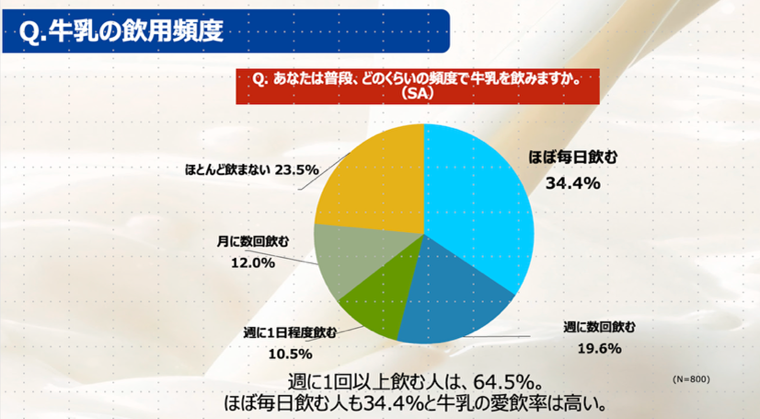 2026年2月に森永乳業が独自に調査した「牛乳に関する生活者の意識調査」では、週に1回以上飲む人は、64.5%。ほぼ毎日飲む人も34.4%と牛乳の愛飲率は高い結果となりました。