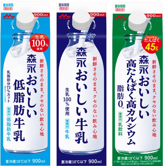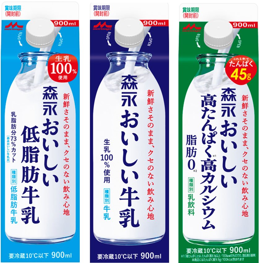 牛乳の利用シーンが多様化し、1回あたりの消費量が減少しているという調査結果を踏まえ、内容量が900mlと450ml(高たんぱく高カルシウムは900mlのみ)の新容量に変更されました。