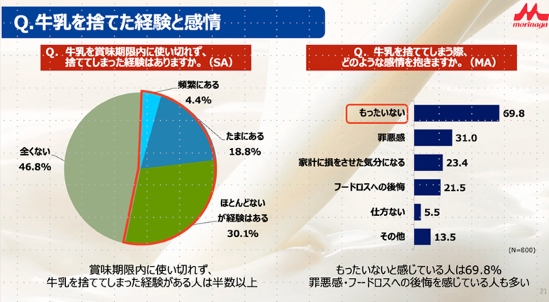 続いて、牛乳を捨てた経験と感情を聞いたところ、賞味期限内に使い切れず、牛乳を捨ててしまった経験がある人は半数以上でもったいないと感じている人は69.8%、罪悪感・フードロスへの後悔を感じている人も多いことがわかりました。