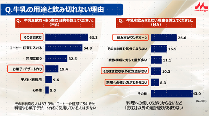 牛乳を飲み切れない理由としては「飲み方がワンパターン」「そのまま飲む以外に方法がない」「料理への使い方がわからない」と 飲む以外の選択肢があまりないと感じている人が多いことが浮き彫りになりました。