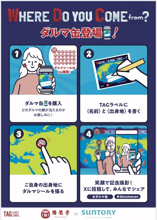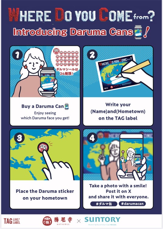 さらに今回はサントリー食品インターナショナル株式会社様とコラボレーション。同社が提供する「TAG LIVE LABEL」を活用した勝尾寺オリジナルラベルドリンク(オリジナルシール付き:税別800円/税込864円)を販売し、特別フォトスポットではダルマのオリジナルシールをご自身の出身地に貼って写真を撮ることができます。