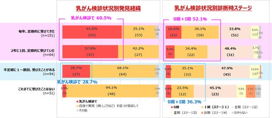 2) 本調査において、乳がん検診を定期的に受けていた人は、不定期に受けたことがある人に比べ乳がん検診で乳がんが発見される割合が高く(60.5% vs 28.7%)、より低いステージ(0期とI期)で発見される傾向がありました。