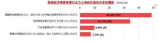 - 患者さんが多遺伝子検査を受けた主な理由として「客観的な数値をもとに自分に合った治療を考えたかったから」(48.8%)が最も多く、次いで「化学療法を受けるかどうか迷っていたから」(34.1%)が挙げられました。