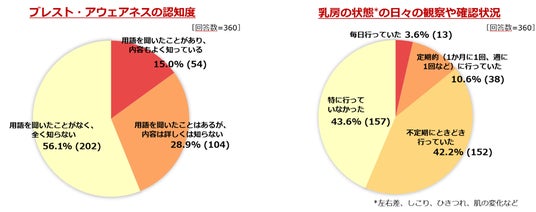 3) 乳房の状態を意識する生活習慣を示す「ブレスト・アウェアネス」の認知度は15.0%(54名)と低く、従って「ブレスト・アウェアネス」を毎日または定期的に実践している人も14.2%(51名)でした。