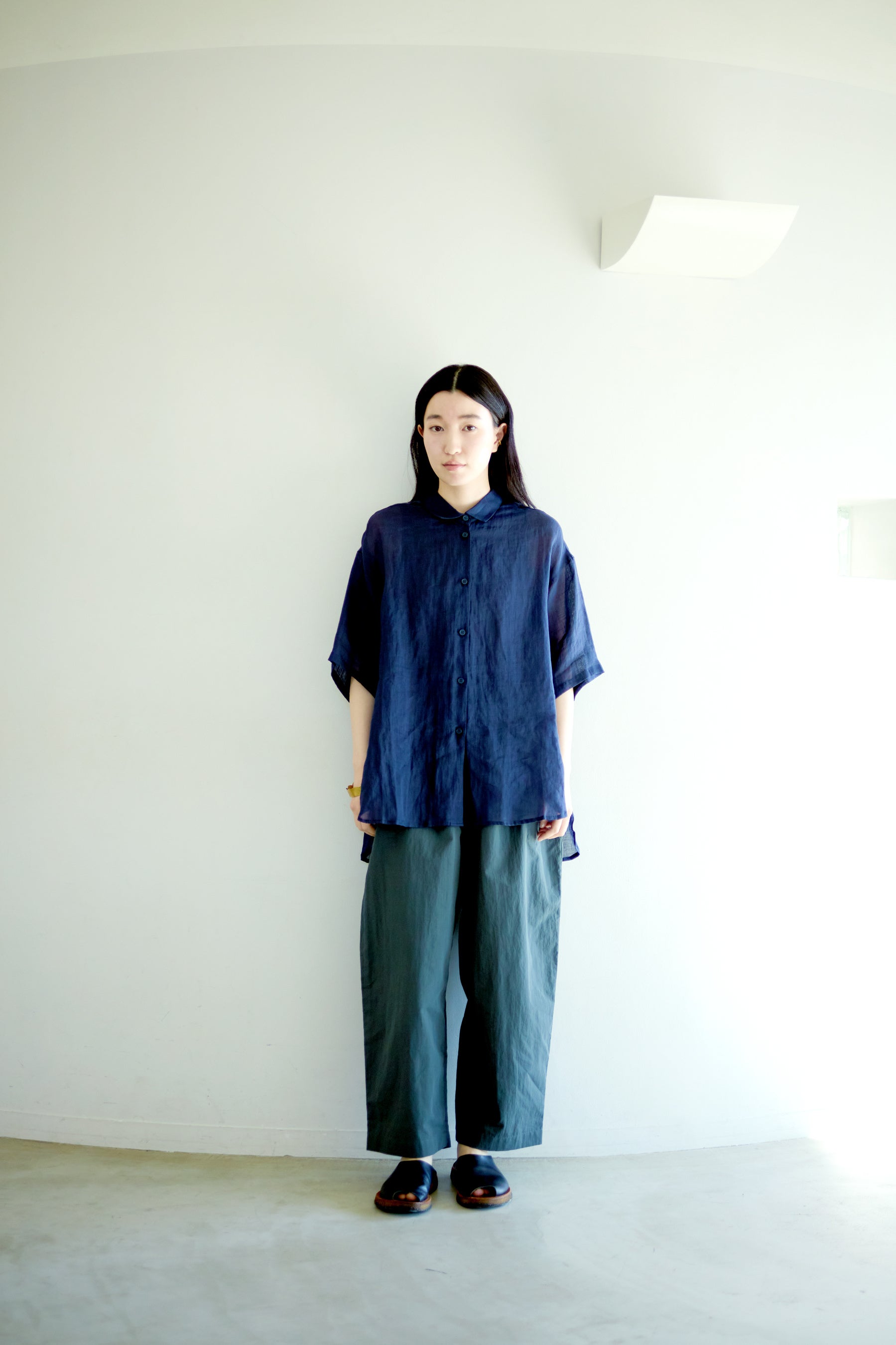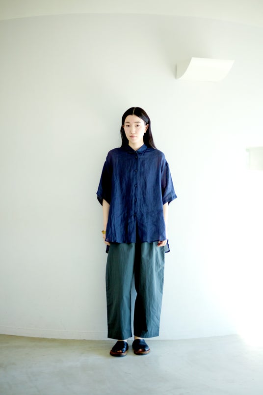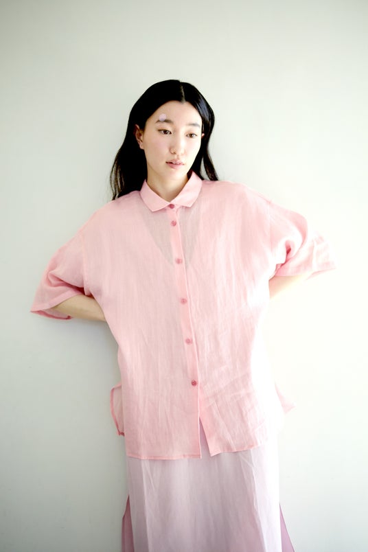 今季の新作。さらりとした肌触りと適度な透け感が特徴の薄手のラミー生地でつくった、メンズライクなオーバーサイズの半袖シャツです。吸湿と放湿性が高いため肌離れが良く、汗をかいても快適に着用いただけます。襟はコンパクトに、そして前後の丈の差をあえて広くつけたりと、ちょっとしたディティールのバランスを工夫することで、シンプルな中にも存在感のある一着に仕上がりました。色は写真のピンクとネイビーのほか、サックスとホワイトがございます。