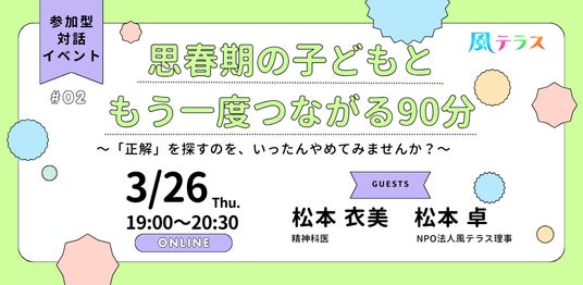 風俗の世界で働く人の相談支援活動を行っているNPO法人風テラスは、3月26日(木)19:00~20:30、親向けの参加型対話イベント「思春期の子どもともう一度つながる90分」をオンラインで開催いたします。