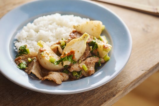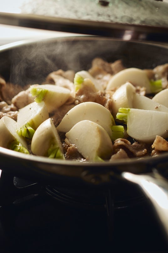 PART1「蒸し煮」より「豚バラとかぶのさっぱり味噌蒸し」。少ない水分とオイルで蒸すことで、野菜の甘みを引き出し、手軽ながらも奥深い一品に仕上がる。