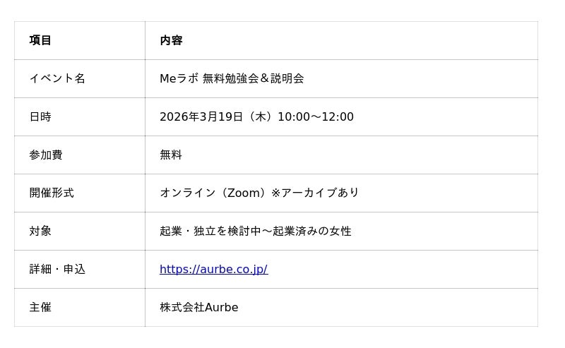女性起業家向け経営実践スクール「Meラボ」を運営する株式会社Aurbe(代表:南部成美・外山紗織)は、2026年4月開講に先立ち、SNS集客や経営戦略をテーマにした無料勉強会を2026年3月19日にオンラインで開催します。Webマーケティングと士業の専門知識を掛け合わせ、女性起業家が安定した経営を続けるための考え方を解説します。(https://aurbe.co.jp/)