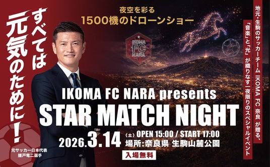 今回の「IKOMA FC NARA presents STAR MATCH NIGHT」では、スポーツと音楽、そして最先端テクノロジーが融合することで、地域に新しいエンターテインメント体験を創出し、生駒の夜空を光の舞台へと変えます。