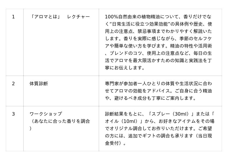 専門スタッフによる丁寧な個別カウンセリングと、お客様一人ひとりの体質・アレルギー・ご要望に細やかに応じて行うオーダーメイドのアロマ調合です。ご参加いただく皆様がリラックスし、安全かつ安心してお楽しみいただけるようサポートいたします。