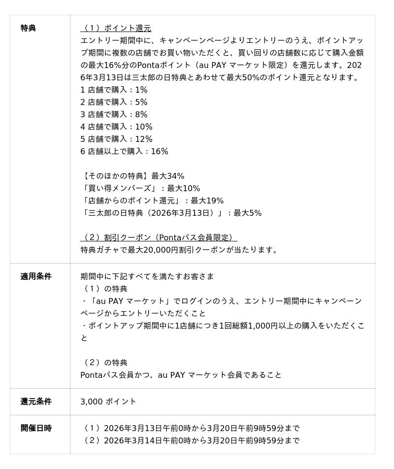 本キャンペーンでは、買い回りの店舗数に応じて2店舗での購入で5%、6店舗以上の購入では最大16%分のPontaポイント(au PAY マーケット限定)を還元します。2026年3月13日は三太郎の日特典とあわせて最大50%のポイント還元となります。そのほか、ハズレなしの特典ガチャ、50%以上割引クーポンの配布、超目玉商品セールを実施し、おトクにお買い物をお楽しみいただけます。