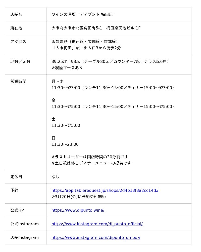 『ワインの酒場。Di PUNTO(ディプント)梅田店 』4月8日(水)オープン!