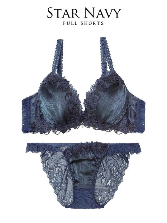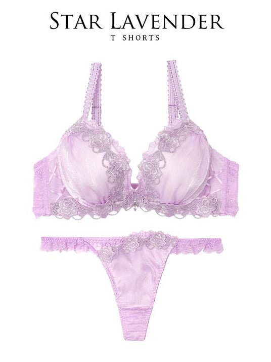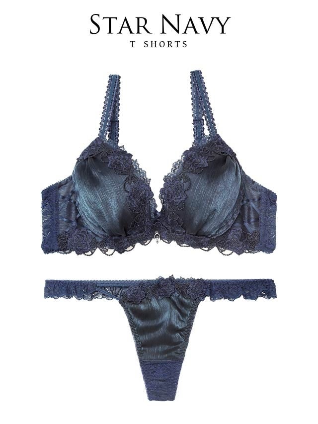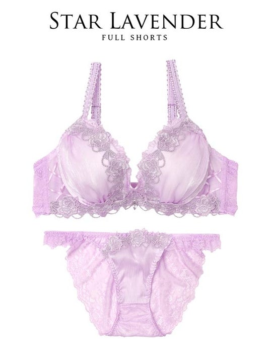 夜空に輝く星のようなきらめきを表現したランジェリー。艶感のある楊柳シフォンとラメ入りケミカルレースが華やかに彩り、クロスコードとチャームがデコルテを美しく演出。ロマンティックな世界観が魅力の一着。