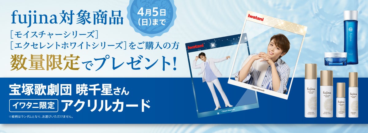 イワタニアイコレクト株式会社(大阪市中央区)は、2026年3月13日(金)から4月5日(日) の期間で、イワタニ公式オンラインショップ「イワタニアイコレクト」で基礎化粧品「fujina(フジナ)」シリーズをご購入の方を対象に、岩谷産業株式会社のイメージキャラクターである宝塚歌劇団 星組トップスター 暁 千星さんのオリジナル「アクリルカード」を数量限定でプレゼントするキャンペーン」を開催いたします。