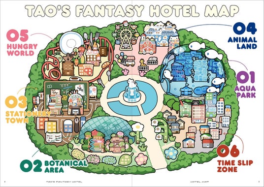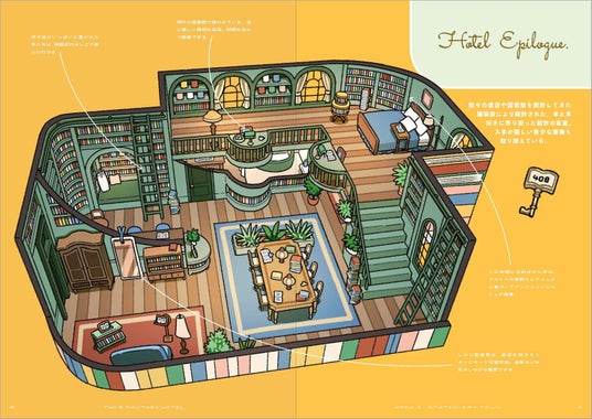 各エリアには、テーマにちなんだコンセプトをまとったホテルがあります。ホテルの外観からフロント、客室、フードにインテリア、アメニティーまで……ページをめくるたび、こだわりたっぷりの空想世界を体験できます。