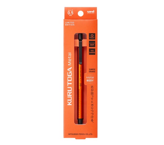 クルトガエンジン機構で芯が回ってとがりつづけるシャープペンシル「クルトガ」シリーズの「クルトガメタル」に、数量限定色のサンライズオレンジが登場。