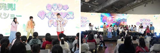 「身近なふしぎ大発見!びっくりサイエンスショー」では、サイエンスエンターテイナーの五十嵐美樹さんが登壇。サポーターとして登場した人気芸人のガンバレルーヤの二人は、生クリームがバターに変わる仕組みを解き明かす実験に全力で挑戦しました。ステージに上がった5名の子供たちとの「バター作り対決」では、ガンバレルーヤの二人が顔を真っ赤にしながら一生懸命にボトルを振り続ける姿に、会場中から大きな歓声と笑いが沸き起こりました。生クリームがバターに変化する様子を見て、ガンバレルーヤの二人は大興奮。参加した子供たち一人ひとりと笑顔で力強くハイタッチを交わし、会場を温かな一体感で包み込みました。