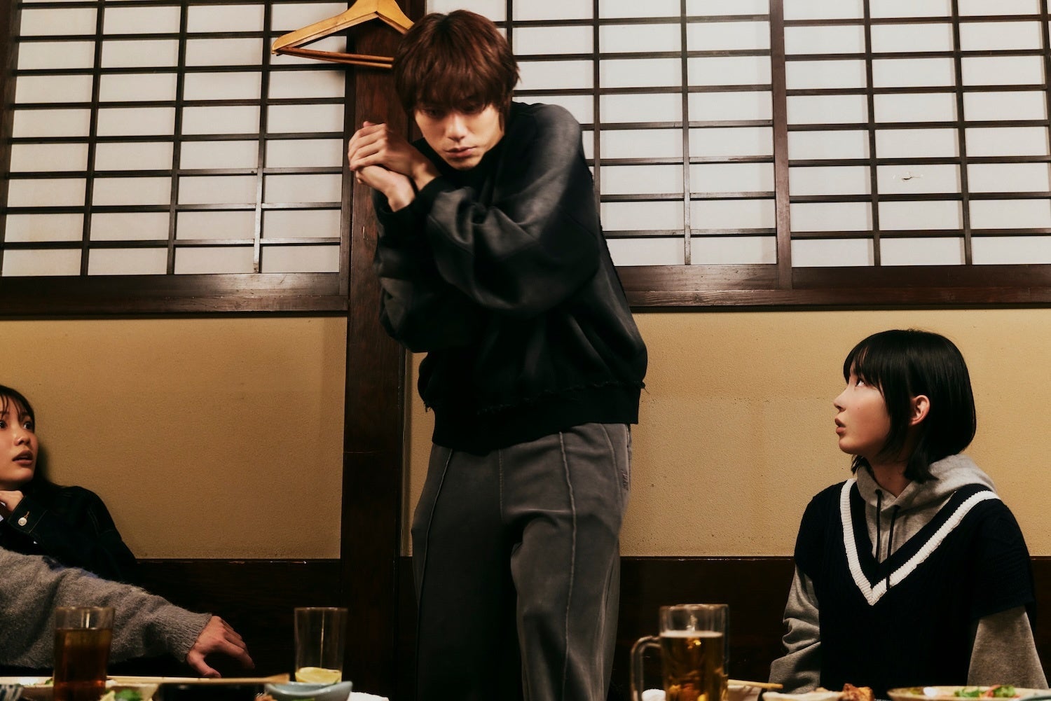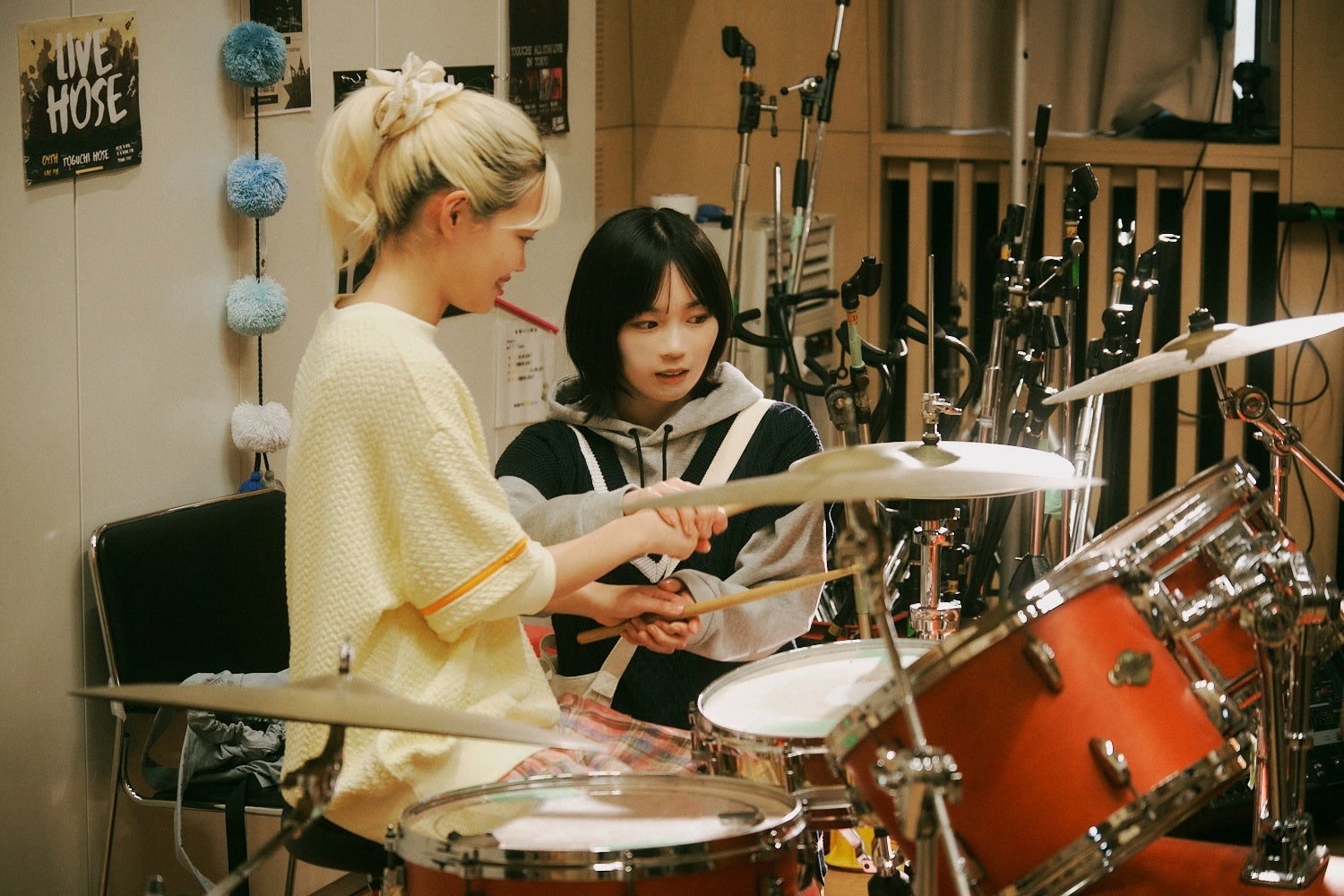 また、第1話より印象的なシーンのオフショットも初公開となりました。ひより(宮崎優)、真奈実(中村里帆)、紗奈(稲川美紅)によるリアルな空気感の「女子会シーン」や、ひよりと会社の先輩・神宮寺涼真(別府由来)の距離が急接近する「タクシーでの密着シーン」を終えた2人の様子など、ドラマの期待感を高める貴重なカットが揃っています。 軽音サークルのオフショットでは、飲み会シーンの撮影中に談笑する出演者たちのリラックスした表情に加え、宮崎優が得意のドラムを共演者に教える一幕も。撮影現場の和やかなムードが伝わってくる内容となっています。