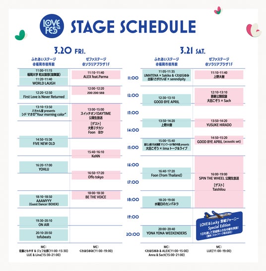 3月20日(金・祝)~21日(土)の2日間、福岡市役所前西側ふれあい広場、ソラリアプラザ1Fゼファの2会場にて開催!LOVE FMならではのグローバルで楽しいフェスが、天神の街に帰ってきます。