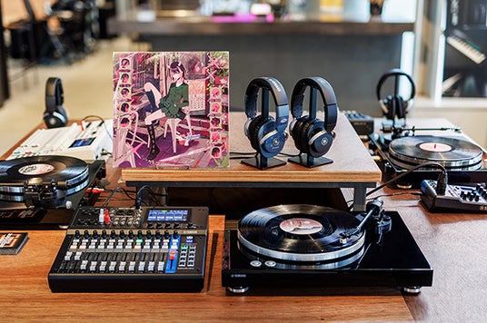 ターンテーブル「TT-S303」とスタジオモニターヘッドホン「HPH-MT8」「HPH-MT8Z」を使用し、ずっと真夜中でいいのに。の楽曲をLP盤で試聴できます。さらに、デジタル音源での試聴環境も用意し、アナログとのサウンドの違いをお楽しみいただけます。