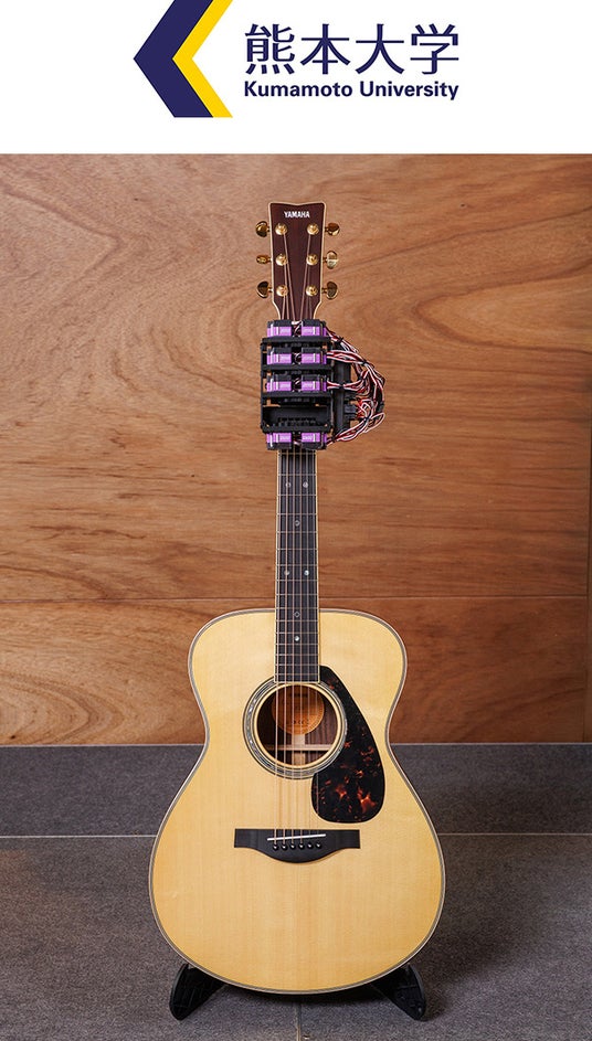 当社が熊本大学と半自動演奏楽器(※2)に関する共同研究を進める中で開発した「自動運指ロボット」を使って、ずっと真夜中でいいのに。とのコラボレーションによるギターの体験展示を初めて行います。「自動運指ロボット」は、ギター初心者にとって難易度の高い、フレットを押さえる手の動きを再現するシステムです。弦を弾くだけでどなたでも簡単に、ずっと真夜中でいいのに。の「秒針を噛む」を奏でることができます。使用する楽器は、ずっと真夜中でいいのに。のボーカル・ACAね氏が愛用しているモデルのひとつでもある、ヤマハ アコースティックギター「LS16 ARE」です。