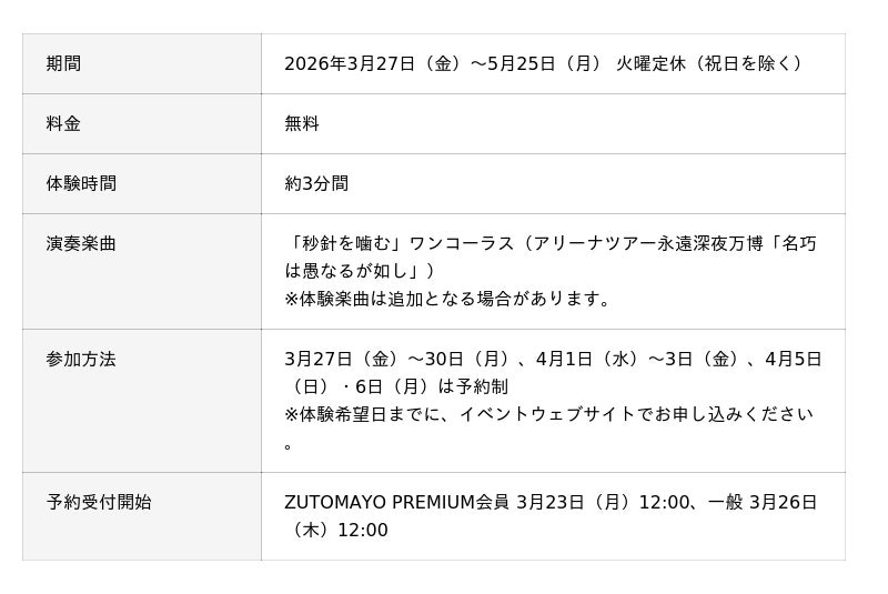 ヤマハ株式会社(以下、当社)は、人気バンド・ずっと真夜中でいいのに。とのコラボレーションイベント『名巧音楽館'26』を、2026年3月27日(金)から5月25日(月)まで、ブランド発信拠点であるYamaha Sound Crossing Shibuya(ヤマハサウンドクロッシング渋谷、以下YSC渋谷)にて開催します。