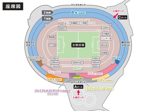 ※プレミアムホスピタリティ、SS席プレミア、SS席、S席、SA席、SB席の購入でA席での観戦が可能です。