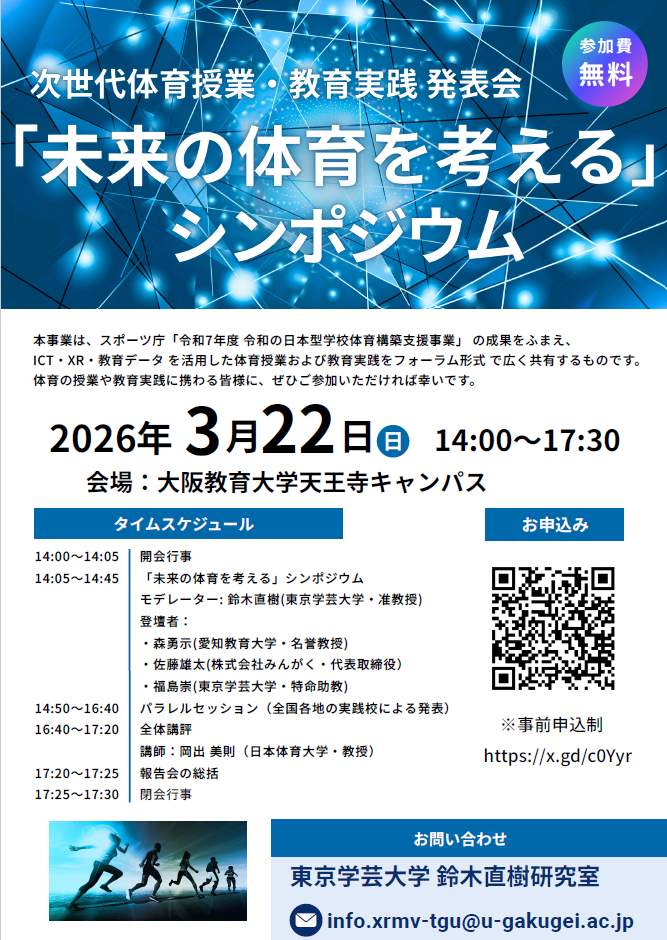 本実践に関連し、ICT・XR・教育データを活用した体育授業の実践共有を目的とした発表会に参加予定です。本発表会では、全国各地の実践校による授業実践の報告が行われるほか、体育科におけるデジタル活用の可能性について議論が行われます。