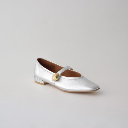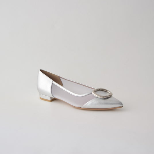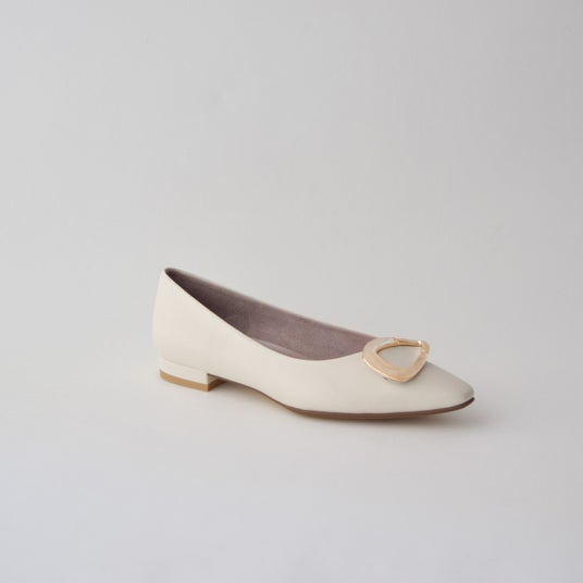 ボリューム感のある金具とゆるっとしたソフトなムードが今っぽいパンプス。有機的なフォルムでハードになり過ぎず、全体の優しげな印象にもマッチ。深めの履き口で包まれるような履き心地。