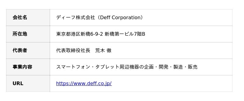 社名「Deff(ディーフ)」は、「Design Evolution For the Future」の頭文字をとったものです。独創性の高いアイデアと進化するデザインで、「今」に最適なライフスタイルを提案し、「もっと便利で快適な未来」を創造していきたいという想いが込められています。