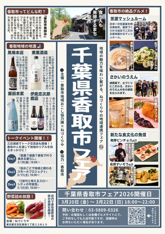 香取市地域おこし協力隊の関係人口創出チームが中心となり、香取市の食や発酵文化、地域の魅力を都内で体感できる「千葉県香取市フェア」を、東京都文京区根津の飲食店「ねづくりや」で開催します。香取市産の食材を活かした料理や香取地域の地酒などを楽しめるほか、香取市民にもご協力いただき、香取の人や暮らし、地域との関わり方をテーマにしたトークイベントを3日連続で実施します。香取市の魅力を“食”を通じて知っていただける機会ですので、ぜひご来店ください。