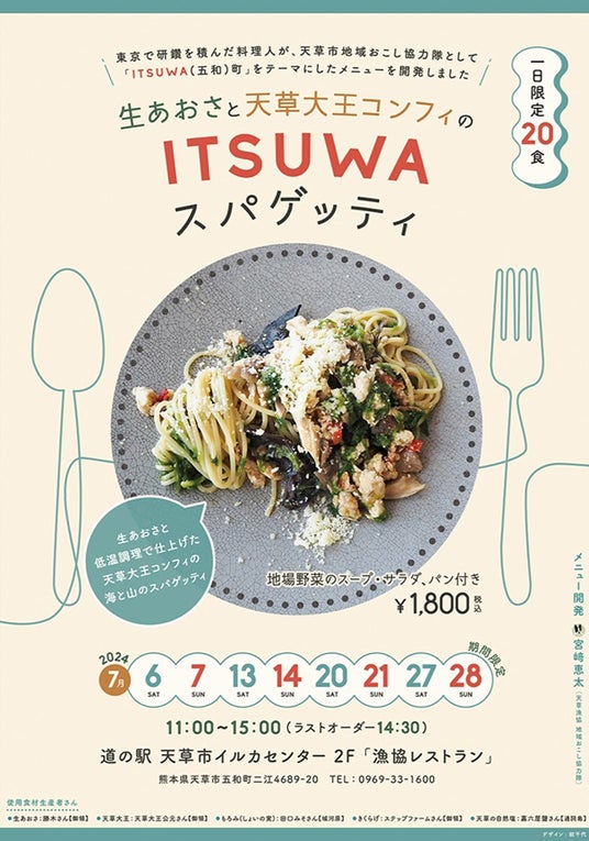 道の駅 天草市イルカセンターで行った期間限定料理のイベント(生あおさと天草大王コンフィのスパゲッティ)