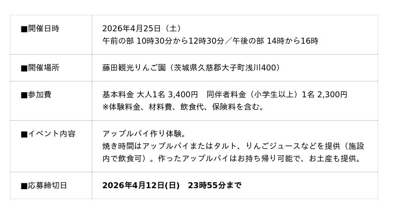 一般社団法人日本自動車連盟(JAF)茨城支部(支部長 幡谷史朗)では、2026年4月25日(土)に藤田観光りんご園(茨城県大子町)にて「JAFデー in 藤田観光りんご園 完熟りんごのアップルパイを作ろう!」を開催します。