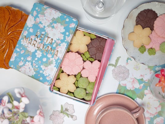 <KEITA MARUYAMA “OMOTASE” PROJECT>大切な人へおいしい時間を贈る、日本ならではの美しい習慣をかたちにしたプロジェクトです。満開の桜をあしらったオリジナルデザインのSAKURAクッキー缶。春の訪れを感じさせる華やかな缶に、一重咲きや八重咲きを表現した桜モチーフのクッキー3種と、抹茶をきかせたクッキー2種を詰め合わせました。