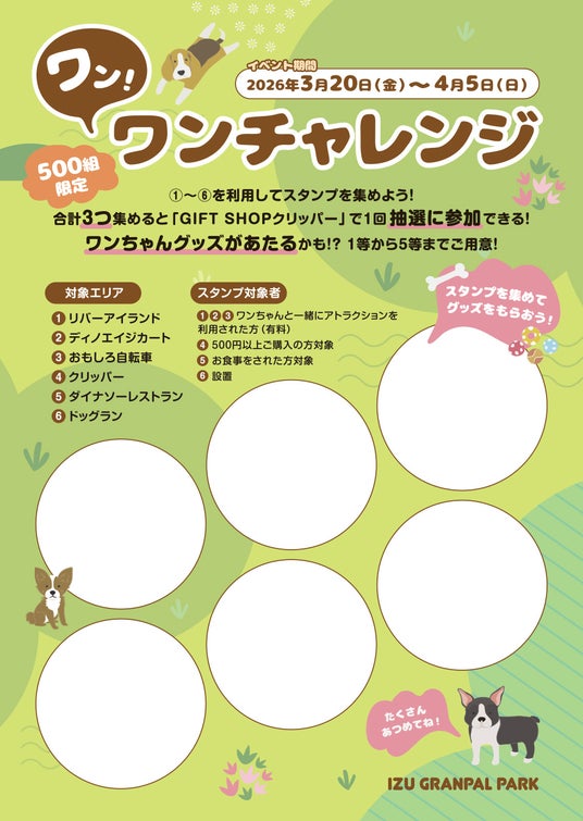 伊豆ぐらんぱる公園は、愛犬との旅のひとときがより充実したものとなるよう、わんちゃんと一緒に楽しめる春のイベント「WELCOMEわんちゃん in ぐらんぱる」を、2026年3月20日(金・祝)~4月5日(日)まで開催いたします。