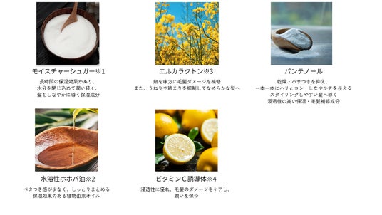 髪の芯まで浸透する保湿成分をベースに、補修成分と質感コントロールの3つの軸でアプローチ。